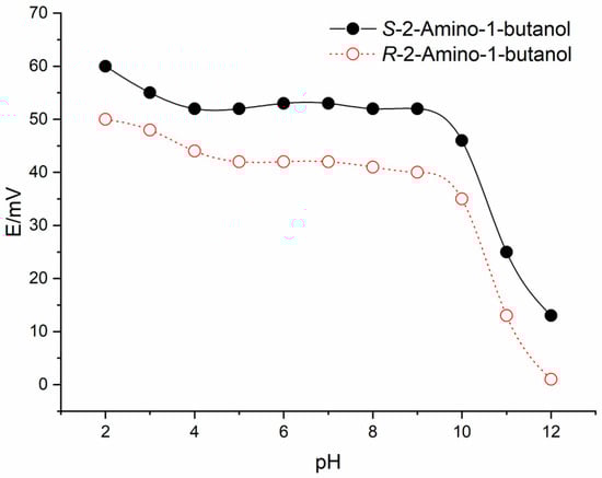 In order to investigate the effect of pH on the response performance of the optimised membrane electrode, the potential response value of the 2-amino-1-butanol solution (1.0 × 10−3 mol·L−1) was measured at different pH values (pH 2.0–12.0). As shown in Figure 6, the potential response value was stable within a pH range of 5.0–9.0. Furthermore, a large difference between the two enantiomers was observed at pH 9.0. Therefore, pH 9.0 was adopted for measurements using the optimised membrane electrode.