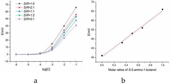 (a) Potential responses of S- and R-enantiomers of 2-amino-1-butanol mixing solutions. (b) Positive linear correlation between the proportion of S-2-amino-1-butanol and potential response values of mixing solutions (0.1 mol·L−1).