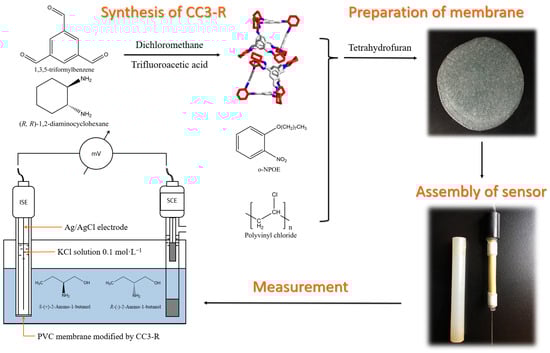 To prepare the PVC membranes, PVC powder, plasticiser (o-NPOE), and CC3-R were added to 3 mL tetrahydrofuran and stirred to form a transparent solution []. This was poured onto a glass sheet and volatilised for 24 h to form a semitransparent film ~0.5 mm thick. The obtained film was incised into an appropriately sized disc and assembled using a PVC tube, which was subsequently filled with 0.1 mol·L−1 KCl as an internal reference solution. A silver chloride electrode was applied as an internal reference electrode, and a saturated calomel electrode was utilised as a reference electrode. For comparison, a CC3-S-modified membrane electrode was prepared in the same way. The overall strategy for enantioselective potentiometric sensor fabrication is depicted in Scheme 1.