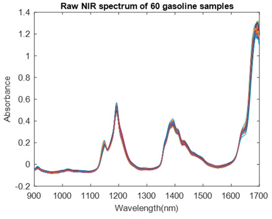 This dataset consists of 60 samples of gasoline measured by NIR spectrometry. The wavelength range was 900–1700 nm at 2 nm intervals (401 channels). The octane value for each of the samples was also included [13]. The raw whole range of the NIR spectrum of 60 samples is illustrated in Figure 4. Because this dataset had been embedded into MATLAB software (MathWorks Inc., Natick, MA, USA), the results were implemented in MATLAB R2017b. The basic source code of the BDA could be downloaded from the inventor’s personal website (http://www.alimirjalili.com/DA.html) or MathWorks official website (https://www.mathworks.com/matlabcentral/fileexchange/51032-bda-binary-dragonfly-algorithm). On the basis of this source code, we implemented the single-BDA, multi-BDA, and ensemble learning-based wavelength selection codes.