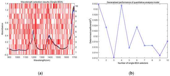 Wavelength selection results using the single-BDA method. (a) Wavelength selection results by applying a 10 times search; (b) corresponding generalized performance of the quantitative analysis model.