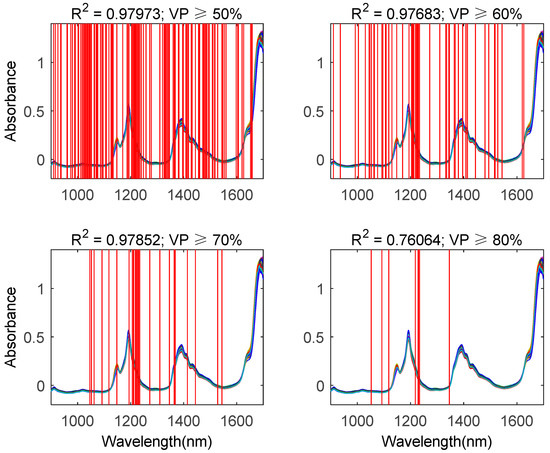 As mentioned above, the difference between the multi-BDA and the single- BDA methods is that there as a voting strategy to aggregate the wavelength selection results of the multiple-time search. The experimental results of the multi-BDA method are shown in Figure 6, from which it is obvious that by adjusting the value of the votes percentage (VP), we can control the number of selected wavelengths. Actually, if VP is equal to or smaller than 40%, the number of selected wavelengths is so large that the dimension is still high; on the contrary, if the VP is equal to or greater than 80%, there might be no wavelength satisfying this criterion. Hence, here we only show the wavelength selection results with VP between 50% and 80%. By comparing Figure 6 to Figure 5b, we can see that the determined coefficient R2 of the quantitative analysis model established on the basis of the wavelengths selected with the multi-BDA method outperformed that obtained with the single-BDA method. However, the case of VP ≥ 80% was an exception, as only 7 wavelengths were selected. This means that if the number of selected wavelengths is too small, the generalized performance of the quantitative analysis model may decrease. Hence, a tradeoff has to be reached.