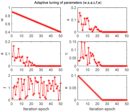 The adaptive tuning procedure of parameters (w, s, a, c, f, e) is illustrated in Figure 8. We can easily find that while the current iteration period is larger than half of maximum iteration, values of parameters s, a, c and e become zero. In other words, the separation, alignment, cohesion and detraction from enemy strategies were not included in the position updating procedure, and only inertia weight and attraction to food f were considered.