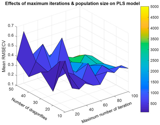 Further, we consider the parameters in Table 2. Previously principal component analysis (PCA) showed that the cumulative contribution of the first two principal components was higher than 90%, hence in this paper we take the first two principal components to establish the PLS regression model. Additionally, 5-fold cross validation is often used so that we can ignore its influence on the model’s performance. Hence, here we put focus on two parameters: maximum number of iterations and number of dragonflies. We implemented a two-dimensional grid to evaluate the influence of these two parameters, in which the maximum number of iterations and number of dragonflies were range from 10 to 100 and 10 to 50, respectively. Because of the limitation of space, here we only take single-BDA as an example. At each parameter value pairs, mean RMSECV of 10 times repeated PLS models with selected wavelengths was computed as the evaluation index. The experimental results were illustrated in Figure 9, from which we can obviously find that with the increase of maximum number of iteration and number of dragonflies (population size), mean RMSECV of 10 times repeated PLS models showed a decrease trend. while the computational complexity increases a lot. Hence, there is a trade-off between them.