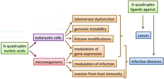 Nucleic acids (NAs) are key targets in medicinal chemistry; in particular, non-canonical NA structures, including G-quadruplex structures (G4s), have been proposed to be involved in genomic instability [1,2], telomerase dysfunction [3], histone modifications [4], modulation of gene expression [5,6,7,8] and viral transcription [9,10], providing possible targets in a number of different diseases. Moreover, G4 structures, from the earlier work of Hardin et al. [11] to the most recent evidence highlighted by Chowdhury [12], are arising as promising regulators of epigenetic modifications [13,14,15]. As a natural consequence, selective recognition and stabilization of G4s by small molecules is emerging as a new general strategy for innovative therapeutics (Figure 1) [16,17,18,19,20,21,22,23].