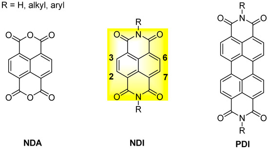 General structure of naphthalene dianhydride (NDA), naphthalene diimide (NDI) and perylene diimide (PDI).