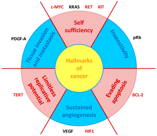 Schematic representation of the six hallmarks of cancer [67], in relation with genes containing G4s in their promoters. Gene marked in red are targeted by one or more NDIs described in this session (adapted from [68]).