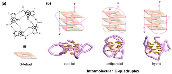(a) Structure and schematic illustration of a G-tetrad. (b) Schematic illustrations of typical intramolecular G-quadruplex (G4) structures: (left) crystal structure of parallel type telomere G4 (PDB code: 1kf1); (center) solution structure of antiparallel type telomere G4 (PDB code: 143d); (right) solution structure of hybrid type telomere G4 (PDB code: 2gku). The figures were adapted with permission from Reference 56. PDB; Protein Data Bank.