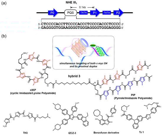 (a) The c-MYC promoter has one putative G4-forming sequence (PQS). (b) Molecules preferentially interacting with its G4 DNAs over other ones. N-Methylpyrrole is highlighted in blue and N-methylimidazole is highlighted in red. Antitumor activities of TH3, IZCZ-3, benzofuran derivative, and Tz 1 are summarized in Table 1.