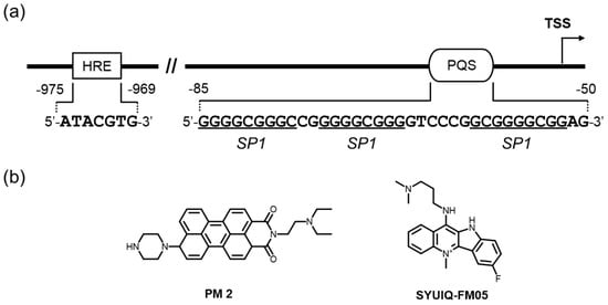 (a) The VEGF promoter has one putative G4-forming sequence (PQS) located close to the transcription start site (TSS) and hormone response element (HRE) that regulate the transcription. (b) Molecules interacting with its G4 DNAs and efficiently suppressing VEGF protein expression. It is worth noting that SYUIQ-FM05 has potential to reduce VEGF-stimulated tumor angiogenesis.
