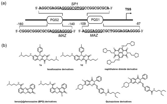(a) The c-kit promoter has two PQSs, where several transcription factors are likely involved. (b) Molecules interacting with its G4 DNA and showing the downregulation of the c-kit gene transcription.