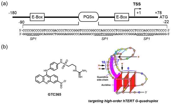 We would like to highlight a unique approach to addressing the issue of hTERT downregulation on the basis of the mutations in a G4-mediated manner. The region located approximately -90 to -22 upstream of the transcription start site was abundant in GC base pairs and has multiple PQSs (Figure 7a) []. In particular, tandemly aligned G4s formed by the entire PQSs have been suggested to be a key mechanism in maintaining the normal transcriptional levels of the hTERT gene [,]. Interestingly, the involvement of the dynamic equilibrium of such three-dimensional structures of DNA upon the somatic mutations (G/C to T/A) in this region is attributable to activated TERT expression []. Hurley and colleagues developed a small molecule that binds to the higher-order G4 structure observed in the hTERT promoter via dual-motif targeting for the G4 and the mismatched duplex stem loop (GTC365, Figure 7b) []. The mutations situated at a mismatched duplex-stem loop within G4 structures alter the folding pattern of G4s to increase the gene expression, likely by inhibiting a certain transcription repressor. The interplay of GCT365 and the element was proposed to act like a chaperone to steer the correct folding seen in the wild-type G-rich element of the promoter, resulting in the reactivation of the silencing function.
