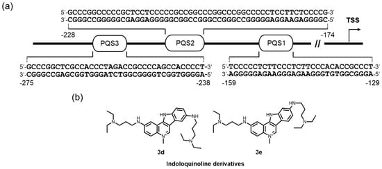 (a) The human KRAS promoter has three PQSs. In particular, the G4 formation at the most proximal PQS (PQS1) is shown to act as a stronger transcriptional repressor. (b) Molecules interacting with its G4 DNA and causing antitumor activities.