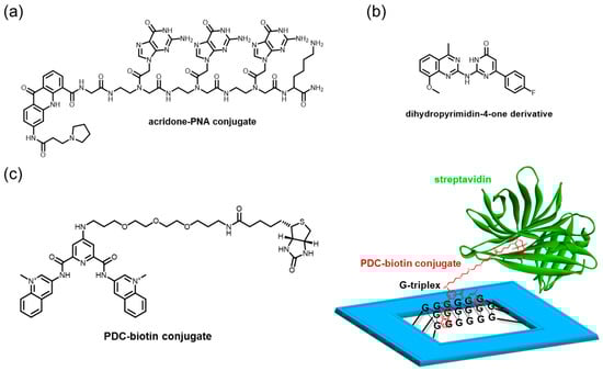 Our group has devised a nanoplatform constructed by DNA origami for studying such intermediates of G4, such as G-triplex and G-hairpin, and has found that pyridostatin (PDC), a well-known ligand interacting with G4, unexpectedly recognized the G-triplex and G-hairpin structures (Figure 10c) []. Considering this, the ability to recognize the intermediates of G4 might be an essential component for the high binding affinity, selectivity, or inducing ability of the G4 structures from the stable duplex or single-stranded DNA. The platform manifests the power to assess unprecedented G4-binding properties of a ligand.