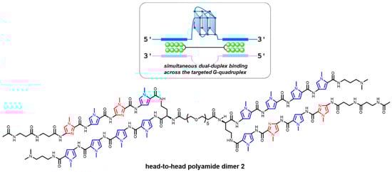 By taking advantage of the sequence-selectivity of PIPs, as mentioned earlier, a head-to-head-type polyamide dimer was developed for the selective targeting of a designated G4, which displayed an inducible effect toward G4 formation (Figure 11) []. This strategy relies on a totally new ligand design based on the targeting of the duplex region on either side of an intended G4 in the genome. Although the results presented are still preliminary, such simultaneous dual-duplex binding across the targeted G4 has the potential advantages of being (1) independent of G4 topology, (2) targetable to other higher-order DNA structures such as i-motifs, and (3) programmable for a large variety of targets at different genome locations.
