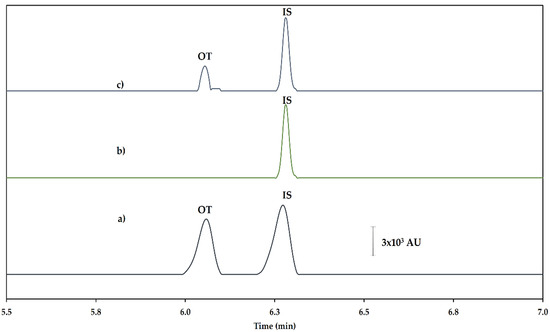 Electropherograms obtained for (a) the standard spiked sample in LVSS-CE (500 µg L−1 oxytetracycline (OT) and 500 µg L−1 IS), (b) the blank milk sample in SPE-LVSS-CE, and (c) the milk sample in SPE-LVSS-CE.