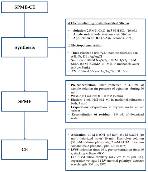 The present work describes the design and validation of a direct immersion SPME methodology combined with capillary electrophoresis. The SPME methodology is based on the use of a stainless steel 316 bar coated with a new crosslinked copolymer of 1-allyl-3-methylimidazolium chloride and methacrylic acid as extracting phase. In order to generate a greener methodology, the polymer was obtained using electrochemical polymerization because it is considered an environmentally-friendly since the synthesis steps and the use of organic solvents are minimized [20].