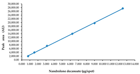 The linearity of this method was assessed by applying a standard solution of examined nandrolone decanoate at 6 concentration levels in the range from 0.156 μg/μL to 2.500 μg/μL (0.156, 0.312, 0.624, 1.250, 1.800, 2.500). A quantity of 5 μL of each working solution was spotted on HPTLC plates to achieve spots of 0.780, 1.560, 3.120, 6.250, 9.000, and 12.500 μg/spot. The plates were developed using adopted chromatographic conditions. The peak area of nandrolone decanoate at each concentration was recorded by means of a TLC densitometer at λ = 245 nm. To obtain the average standard calibration plot, each analysis was repeated 6 times. The linear regression model was used for peak area and the amount of nandrolone decanoate. Linearity was determined as the relationship of peak areas A [AU] to the amount of nandrolone decanoate X [μg/spot].