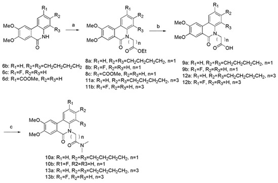 4-(8,9-dimethoxy-6-oxo-1,3,4,6-tetrahydro-2H-benzo[c]phenanthridin-5-yl)-N,N-dimethyl-butyramide (13a) White solid, yield 84.%, m.p. 249.2–251.5 °C. FTIR (KBr, cm−1) 3436, 3135, 2924, 1643, 1597, 1501, 1403, 1320, 1264, 1229, 1205, 1174, 1034, 996, 868, 776. 1H-NMR (CDCl3) δ 8.05 (d, J = 8.3 Hz, 1H), 7.78 (s, 1H), 7.65 (s, 1H), 7.18 (d, J = 8.3 Hz, 1H), 4.70 (t, J = 6.2 Hz, 2H), 4.11 (s, 3H), 4.05 (s, 3H), 3.25 (t, J = 5.9 Hz, 2H), 2.99 (s, 3H), 2.96 (s, 3H), 2.58 (t, J = 7.6 Hz, 2H), 2.58 (t, J = 7.5 Hz, 2H), 2.35-2.29 (m, 2H), 1.94-1.88 (m, 4H). 13C-NMR (CDCl3) δ 172.7, 156.9, 152.5, 149.2, 141.2, 136.9, 134.1, 131.0, 125.5, 119.6, 118.5, 113.8, 104.6, 102.4, 66.3, 56.2, 56.1, 37.3, 35.6, 30.3, 30.2, 25.4, 25.0, 23.4, 23.3. ESI-MS m/z: 423.22 ([M + H]+). Anal. Calcd for C25H30N2O4: C 71.07; H 7.16; N 6.63; O 15.15. Found: C 70.82; H 7.22; N 6.37; O 15.31.