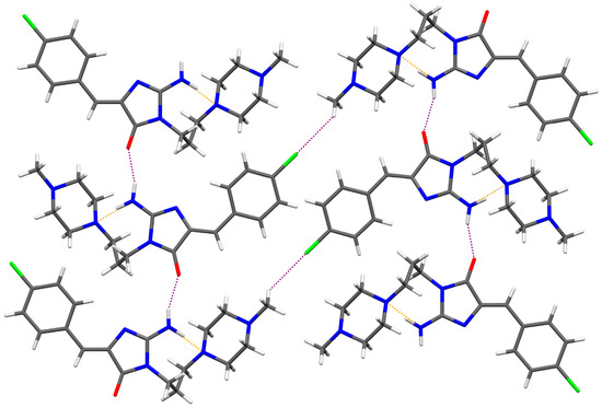 The crystal network in the studied structure can be characterized by N5-H5A···O1 intermolecular hydrogen bonds, creating a chain C(6) along [001] direction [30]. Furthermore, the C13-H13B···Cl1 interactions between the chains, which lead to the formation of layers (Figure 4), are observed (Table 2).