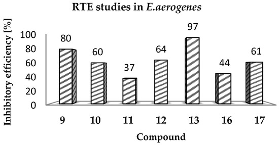 Results have demonstrated that majority of the tested compounds caused a decrease in the fluorescence of 1,2′-dNA in the treated bacterial cell. The effect observed was most probably due to molecular interactions between fluorophore and compounds tested that result in increasing fluorescence quenching [33,34]. In order to analyze and quantitatively compare the ability of tested compounds to inhibit the efflux of 1,2′-dNA in the RTE assay, the inhibition efficiency (IE) of each compound was calculated. The IE parameters have indicated that all the tested compounds promoted the accumulation of 1,2′-dNA through the inhibition of its efflux outside bacterial cells overexpressing AcrAB-TolC (Figure 5).