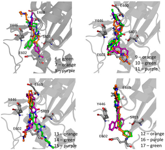 For compounds 6–8, there are high variations in docking poses, as the pose of compound 6 depicted in green is flipped in comparison to poses of compound 7 and 8, and the docking pose of the most active compound 7 is only slightly different from less active compound 8. An analogous situation occurs for compounds 9–11, where molecules are differently docked to the allosteric site of PBP2a, but the flipped orientation of compound 10 (which has similar activity to compound 9 and 11) is difficult to correlate with observed activity relationships (an analogous situation occurs for compounds 13–15). The last group of analyzed compounds (12, 16, 17) with activity decreasing in the following way: 16 > 12 > 17 adopted significantly different docking poses. The most active compound 16 displays an extended network of ligand–protein interactions, including those that occur for the anthracene moiety: lysine at position 148, glutamic acid at position 150 and arginine at position 151. For compound 16, a set of hydrogen bonds that is not observed for other compounds in the analyzed subgroup is present, which take part in the interactions with serine and threonine from positions 240 and 238, respectively.