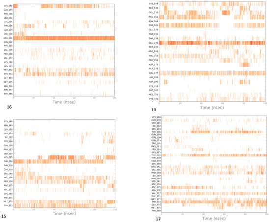 On the other hand, when the outcome of molecular dynamic simulations within the allosteric site of PBP2a is analyzed (Figure 9), the most visible observation from the ligand interaction diagrams is the significantly greater perseverance for all of the considered compounds. For the most active compound (16), the very strong interaction with R241 occurs for almost 100% of the simulation time, and although interactions with other protein residues are less frequent, they are also present during the whole simulation. The slightly different pose of compound 10 led to a different set of present interactions, the most frequent of which was with E239. Compound 15 interacted more frequently with K215 and T216, although the latter interaction appears after about 20 ns of simulation. For the inactive compound 17, there is no such interaction that occurs for almost 100% of simulation time, although the compound pose in the allosteric site of PBP2a is also rather preserved during the whole molecular dynamic studies.