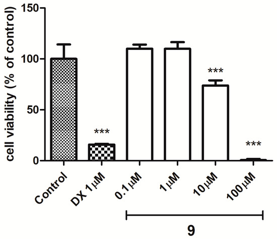 The viability of HepG2 cell line after incubation with compound 9 for 72 h. DX—doxorubicin. Control—1% DMSO in the cell culture media. The statistical significance was evaluated by a one-way ANOVA, followed by Bonferroni’s Comparison Test (*** p < 0.001 compared with control).