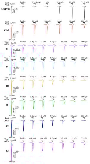 Representative current traces for NS1738, galantamine, and selected compounds from α7 nAChRs expressed in Xenopus oocytes. Cells were subjected to two-electrode voltage-clamp electrophysiology experiments; the oocyte membrane potential was clamped at −60 mV. All experiments involved a pre-incubation protocol that consisted of 25 s application of the test solution (or a saline solution for the reference trace) followed by 20 s co-application with 30 µM ACh. The representative traces were baseline subtracted, and the bars above each trace represent the application periods, and concentrations of the test solutions appear above the bars. The majority of the washing periods (3 min) between each trace are omitted.