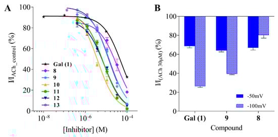 In this assay, galantamine as well as compounds 8 and 9 showed ~30% inhibition of (30 µM) ACh-induced currents when tested at −50 mV (note that galantamine was tested at 30 µM and compounds 8 and 9 due to their higher potency, at 10 µM). Inhibition increased for galantamine and compound 9 when tested at −100 mV and was different for each compound: 42% for galantamine and 25% for compound 9. Inhibition decreased 13% for compound 8 (Figure 3B). These results indicate that compound 8 is binding in the ACh pocket; however, compound 9 might work as a pore blocker or possibly has a mixed mechanism of action.