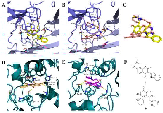 Binding mode of the two dual-active compounds in the α7 nAChR homology models and AChE X-ray structure. Compound 8 in the α7 nAChR (A) and AChE (D) binding pockets. Compound 9 in the α7 nAChR (B) and AChE (E) binding pockets. Both compounds superimposed in the α7 nAChR (C) pocket showing common pharmacophores. Compound 8 binds to the α7 nAChR (A) through three hydrogen bonds (yellow dotted lines) to Q57, Q117, and W149; compound 9 exhibits similar interactions with the same amino acids Q57, Q117, and W149. In the AChE pocket, compound 8 (D) binds through hydrogen bonds to Y124, Q202, S203, and H447 and a cation-π interaction to W86 (blue dotted line). Compound 9 (E) creates hydrogen bonds to Y72, Y337, and R296 and a cation-π interaction to Y341. (F) Structure of compounds 8 and 9.
