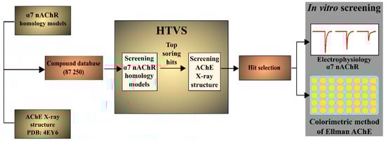 Screening workflow. Virtual screening was performed at two α7 nAChR homology models having different volumes of the binding pocket. Top scoring hits from both models were subsequently screened at the X-ray structure of AChE (PDB ID: 4EY6). From hits scoring high at both targets, 13 compounds were selected and tested in vitro. HTVS = high throughput virtual screening.