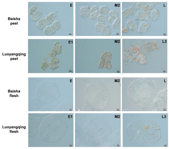 Plastids of Luoyangqing and Baisha loquats in the peel and flesh cells of fruits at early, middle, and late maturity stages under a light microscope. Bar = 20 μm.