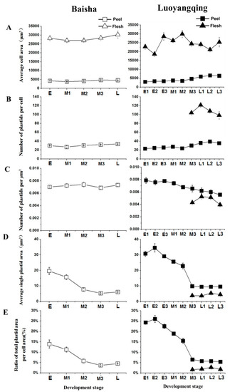 Changes in cell size and plastid number and size during the ripening of Luoyangqing and Baisha loquat fruits. (A) Cell size indicated by area; (B) plastid population; (C) plastid density; (D) plastid size indicated by area; (E) plastid size (by area) relative to cell size (by area).