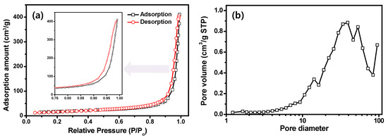 The N2 adsorption–desorption isotherms and the pore size distribution of the SCNPNS are shown in Figure 2. The isotherm curve of the SCNPNS is classified as type IV adsorption isotherm with H3 hysteresis loop at high pressure, signifying the network of the porous structure (Figure 2a). Based on the desorption curve, the BET surface area of SCNPNS is calculated to be 60.2 m2 g−1. The Barret–Joyner–Halenda (BJH) pore size distribution of SCNPNS is illustrated in Figure 2b. The average pore size is ca. 39 nm with a pore volume of 0.59 cm3/g, suggesting the mesoporous nature of as-synthesized SCNPNS. The mesoporous structure can provide higher surface area and more active sites, which are very useful for environmental applications such as adsorption, photocatalysis, and gas sensing.