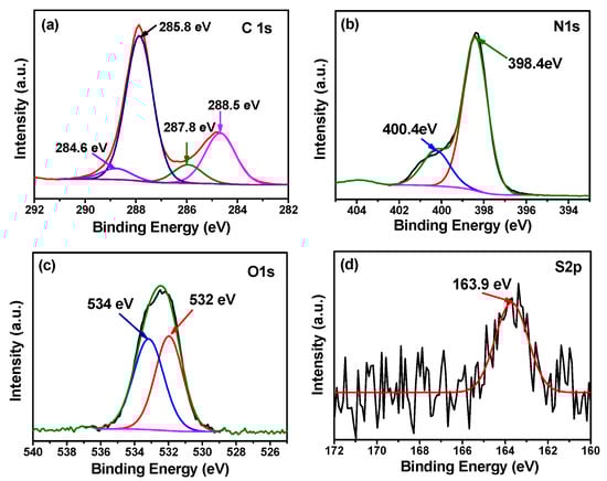 An XPS analysis was performed to reveal further details on the chemical composition and oxidation state of SCNPNS prepared at 520 °C. An XPS survey spectrum confirms the presence of carbon, nitrogen, and oxygen atoms (data not shown). The intensity of the N peak shows high intensity due to the maximal atomic ratio of N in the SCNPNS. In addition, there was no distinct peak of sulfur (S) in the survey spectrum of SCNPNS because of the very low contents of S in the sample (0.1%). Figure 3 shows the core spectra of C 1s, N 1s, O 1s, and S 2p1/2, in order to investigate the bonding states of each element. The C 1s core spectrum is deconvoluted into four peaks centered at 284.6, 285.8, 287.8, and 288.5 eV (Figure 3a). The peak at 284.6 eV is assigned to sp2 graphite C=C bonds, whereas the peak at 285.8 eV is attributed to C–N group. The main strong peak at 287.8 eV is attributed to sp2 carbon–nitrogen (N–C=N) bonding of the aromatic ring system (such as the s-triazine unit and pyridine-like structure), whereas the peak at 288.5 eV is assigned to tertiary nitrogen N–(C)3 groups, i.e., nitrogen trigonally bonded to three sp2 carbon atoms in the C–N network [39,40,41]. The asymmetrical N 1s spectrum in Figure 3b can be deconvoluted into two peaks with binding energies at 398.4 eV and 400.4 eV, which are ascribed to sp2-hybridized nitrogen (C=N–C) and amino functional groups with a hydrogen atom (C–N–H), respectively [42]. As illustrated in Figure 3c, the core spectrum of O 1s has two symmetrical peaks around 532 eV and 534 eV, which are assigned as the existence of N–C–O groups and surface adsorbed water, respectively [43]. Figure 3d shows the core spectrum of S 2p1/2 at 163.9 eV, indicative of the C–S bond in SCNPNS with substituted sulfur for lattice nitrogen [44].