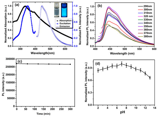 The excitation-independent fluorescence emission is observed in Figure 4b. With the increase of excitation wavelength from 290 to 380 nm by 10-nm intervals, the normalized PL intensity was increased for the excitation wavelength up to 350 nm, but a further increase in the excitation wavelength (>350 nm) resulted in a decrease in the PL intensity without the shift in the emission wavelength. Thus, the maximum excitation and emission wavelengths of the SCNPNS were found to be 350 nm and 445 nm, respectively. These excitation-independent fluorescence phenomena suggested that the SCNPNS exhibited a single-emission fluorescence center with high crystallinity [46]. As shown in Figure 4c, the PL intensity of the SCNPNS was stable without apparent photo-bleaching even under UV-light illumination with a high-pressure mercury vapor lamp for 300 min.