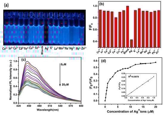Silver is a widely used material owing to its high thermal and electric conductivity [7]. Almost 2500 tons of silver have been released into the environment every year because of its wide use in a number of industries, such as agriculture, pharmaceuticals, mirrors, and foods [8]. It was discovered that Ag+ can bind through several metabolites and enzymes, consequently leading to the obstruction of their normal functions [9]. Nowadays, silver is considered one of the most harmful and worldwide contaminants, with a simple impact on the aquatic biota and public health [10]. Therefore, the selective recognition of Ag+ offers significant advantages so that many different analytical approaches have been investigated [11,12]. However, most of these methods have common limitations such as high cost, time consumption, and low sensitivity [13]. Appropriate fluorescent probes which can address these practical concerns are in high demand [14,15,16]. The majority of fluorescent probes are employed as metal nanoparticles and metal chalcogenides, needing further surface modification to mitigate their own toxicity reflections. Thus, facile, efficient, and robust detection of Ag+ ions are still challenging tasks. It is extremely important to fabricate simple, low-cost, metal-free sensors to promote environmental and human well-being.