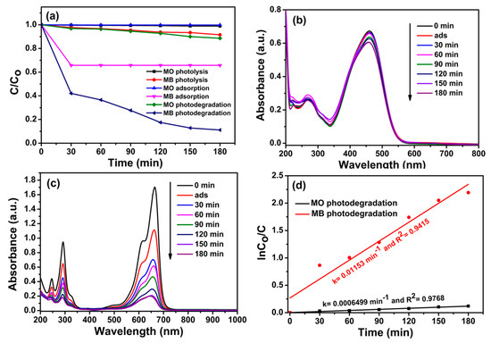 According to Figure 7a, the photocatalytic performance toward MB was significantly superior to the degradation of MO. After 180 min of photocatalytic reaction, 90% of MB was degraded, whereas only 14% of MO was degraded under identical conditions. Figure 7b,c display the variation in the characteristic absorption of MB and MO over the SCNPNS under visible light, respectively. MB almost disappeared within 180 min, whereas the absorbance of MO does not change significantly during the same length of adsorption times. No peak shift in the maximum absorption wavelength was observed for either dye, indicating a lack of other identifiable fragments [60].