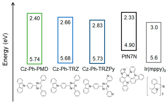 2.1. Effect of the Acceptor Moieties in Host Materials on the Emission Spectrum of PtN7N