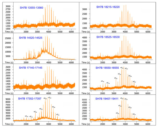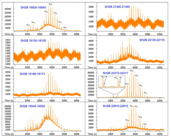 The GC-MS chromatograms of samples are illustrated in Figure 2 and Figure 3. It can be seen from the two figures that very few hydrocarbons are identified from these samples, but unresolved complex mixtures (UCMs) occur as a big hump associated with the long-chain n-alkanes in most of them. As a whole, n-alkanes for every sample are primarily concentrated in a relatively narrow range of nC22–nC30, and characterized by the unimodal distribution with a maximum abundance at nC26. It is noteworthy that pristane and phytane are identified with the feature that phytane is always more abundant than pristane, but terpanes and steranes are undetectable.
