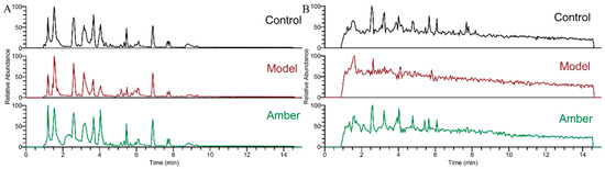 Base peak chromatograms (BPCs) of cortex samples of control group, model group, and amber group under ESI+ (A) and ESI− (B) MS conditions.