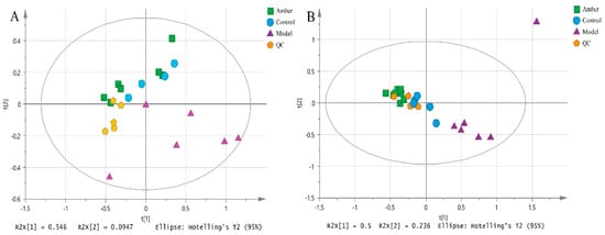PCA scores scatter plot for control group, model group and amber group. (A) positive mode, R2X (cum) = 0.641, Q2 (cum) = 0.461; (B) negative mode, R2X (cum) = 0.836, Q2 (cum) = 0.449.
