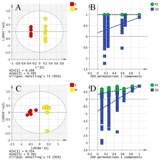 OPLS-DA score plot and validation plot of the OPLS-DA model of control group and model group. OPLS-DA score plot for the first two components showed the separation between the control group and model group. The fitness (R2Y) and prediction power (Q2Y) of this two-component model were 0.979 and 0.918, respectively ((A) ESI+; (C) ESI−). Validation plot of the OPLS-DA model of control group and model group were obtained from 200 permutation tests. The intercepts of R2 were lower than the original point to the right, whereas those of Q2 were negative, indicating no signs of overfit ((B) ESI+; (D) ESI−).