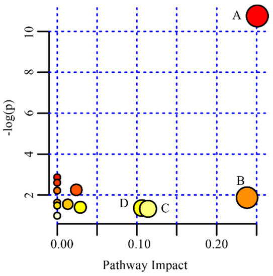 Summary of pathway analysis with MetPA. (A) glycerophospholipid metabolism; (B) nicotinate and nicotinamide metabolism; (C) alanine, aspartate and glutamate metabolism; (D) pyruvate metabolism.