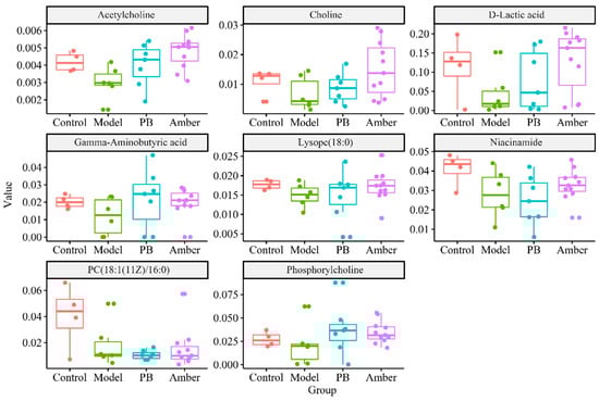 Boxplot of the metabolites associated with the four pathways in Figure 7.