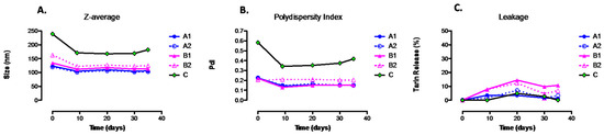 Physicochemical characterization and stability evaluation of liposomal of tarin formulations. The Z-average (A), polydispersity index (B) and leakage (C) of liposome preparations storage at 4 °C were monitored for 40 days. A1, A2, B1, B2, and C represent distinct liposomal encapsulation formulations, presented in Figure S1.