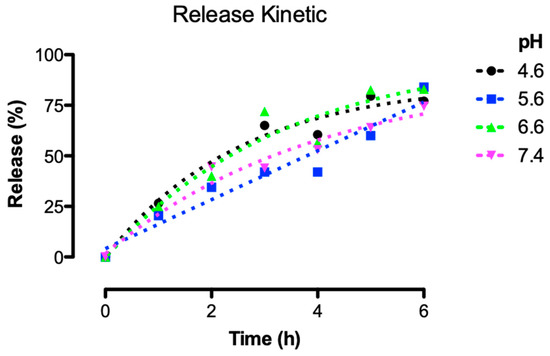 To evaluate the performance of the liposomes formulated with DOPE, PEG, and CHEMS, dissolved in chloroform and extruded through a 0.2 μm membrane (A1 formulation), a kinetic release assay was carried out for 6 h, mimicking human body pH conditions (4.6, 5.6, 6.6, and 7.4). The liposomes produced herein were capable of releasing entrapped tarin in a controlled manner, in both acidic and neutral environments. The time necessary to release half the tarin loads at pH 4.6 and 6.6 was reached in 2.3 h, occurring between 4 and 5 h for pH 5.6 and, for pH 7.4, around 4 h. After 6 h, almost 80% of the tarin had been released at all pHs of interest (Figure 3).
