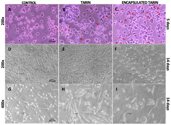 Control cells were smaller and presented homogeneous and similar morphological characteristics, with no significant variability within the cell population (Figure 5A,D,G). However, after 14 days of treatment, tarin in its free form (Figure 5E,H) led to a high number of fibroblast-like cells, while a significant amount of large round cells was detected in wells containing encapsulated tarin, with the suggestive appearance of stromal and progenitor cells, respectively (Figure 5F,I).