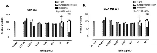 The antitumoral activity of free and encapsulated tarin in comparison with empty liposomes was tested against human glioblastoma U-87 MG and human breast adenocarcinoma MDA-MB-231 cell lines. Tumoral cells were cultivated in the presence of increasing concentrations of free and encapsulated tarin ranging from 0.78125 to 50 µg/mL for 24 h (Figure 6A,B).